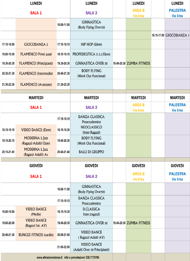 In questa pagina vengono riassunti gli orari dei corsi che verranno effettuati nelle varie sale e per i rispettivi giorni della settimana.